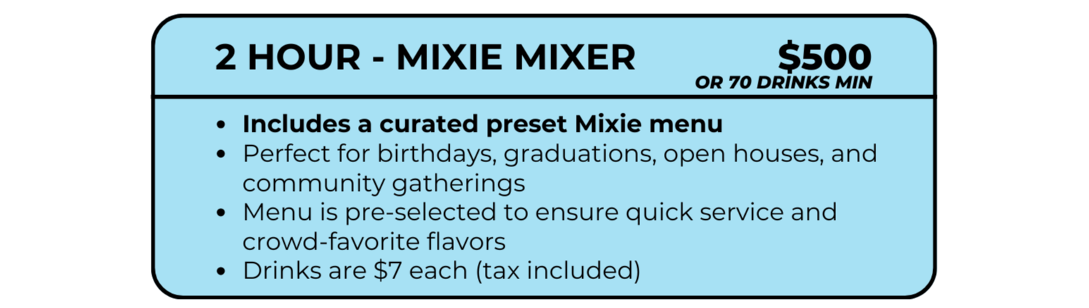 Mixie Mobile offers customizable drink service for private events, with flexible packages designed to fit everything from casual gatherings to large celebrations.
