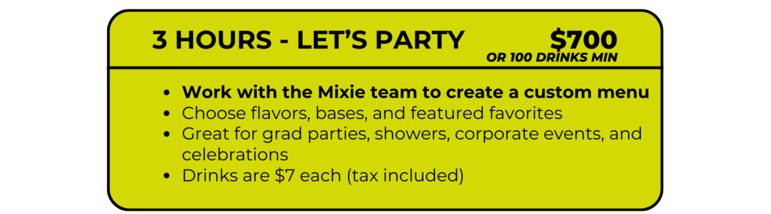 NOTE: Private parties are offered in Douglas and Pope Counties. Travel fees may apply. Deposit is required at time of booking. Mixie events include a minimum sales requirement. Hosts can cover drinks for their guests or let guests purchase on their own. If the minimum isn’t met through guest purchases, the host covers the difference.